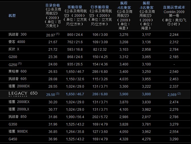 對比總覽 (1) 灣流公司官網(wǎng)(2009年9月) (2) 直接運營成本(DOC)的計算是基于《Conklin & de Decker 2009》第一卷假設(shè)的條件。計算時考慮了羅爾斯羅伊斯企業(yè)維護方案(RR Corporate Care)發(fā)動機維護成本。本結(jié)果僅供對比之用。 (3) 萊格賽650的價格是基于2010年經(jīng)濟狀況