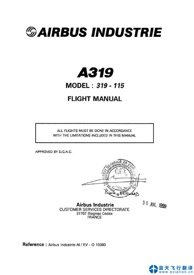 北京藍天飛行翻譯公司完成大型公務機公司的2020年11月10日版本空客公務機ACJ319飛機飛行手冊(AIRPLANE FLIGHT MANUAL)翻譯任務 10 NOV 20 ACJ319 AIRPLANE FLIGHT MANUAL Translation